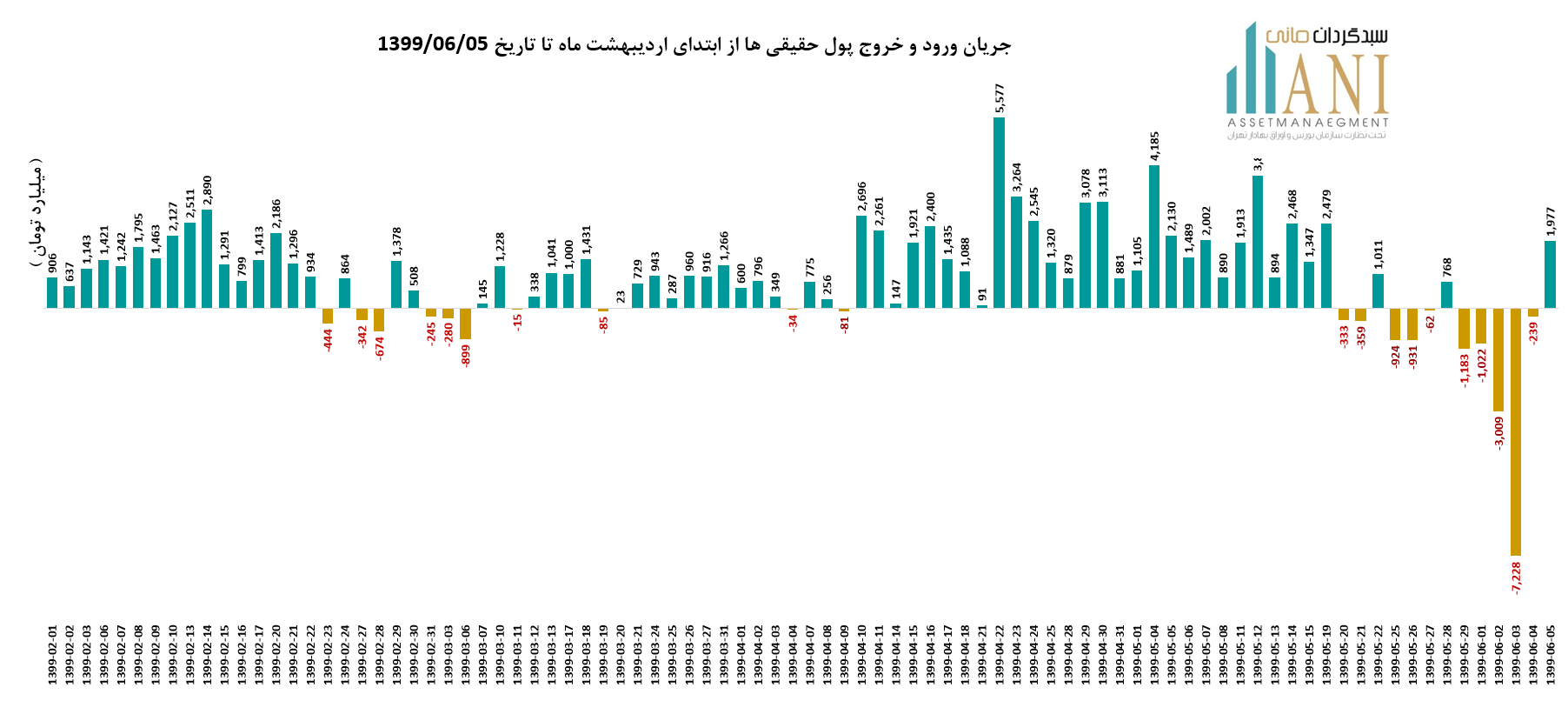 در پایان روز معاملاتی 99/06/05 خالص جریان ورود و خروج پول حقیقی ها حدود مثبت 1,977 میلیارد تومان می باشد. جریان ورود و خروج پول حقیقی ها در سال جاری بدین صورت بوده است: