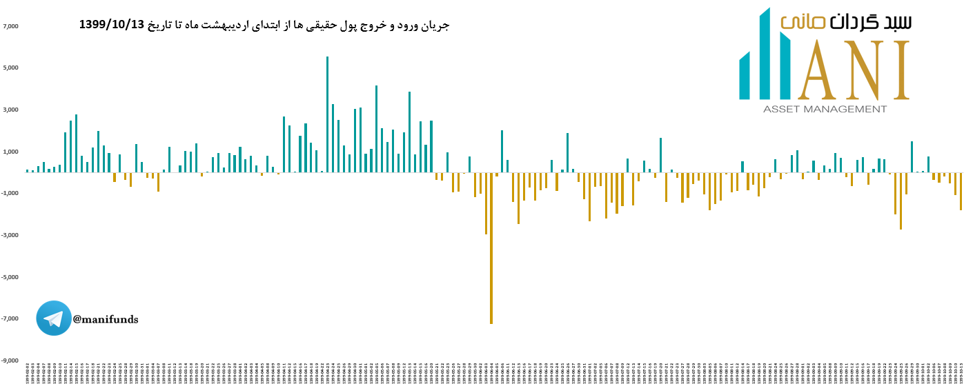 در پایان روز معاملاتی 99/10/13 خالص جریان ورود و خروج پول حقیقی ها حدود منفی 1,789 میلیارد تومان می باشد. جریان ورود و خروج پول حقیقی ها در سال جاری بدین صورت بوده است: