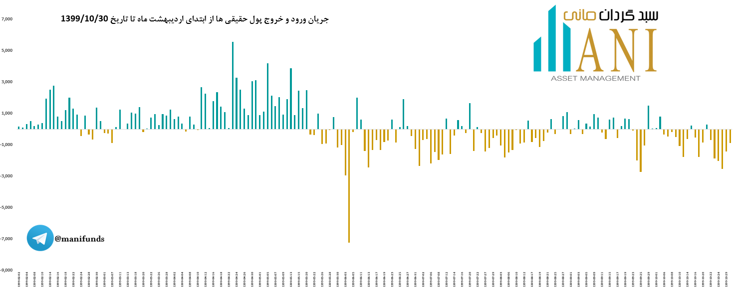 در پایان روز معاملاتی 99/10/30جریان ورود و خروج پول حقیقی ها حدود منفی 889 میلیارد تومان می باشد. جریان ورود و خروج پول حقیقی ها در سال جاری بدین صورت بوده است: