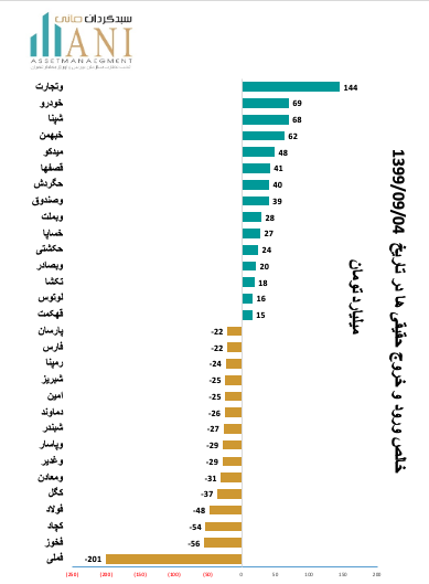 در پایان روز معاملاتی 99/09/04شرکت های بانک تجارت و ایران خودرو به ترتیب با 144 و 69 میلیارد تومان بیشترین ورود پول توسط حقیقی ها را داشته اند.