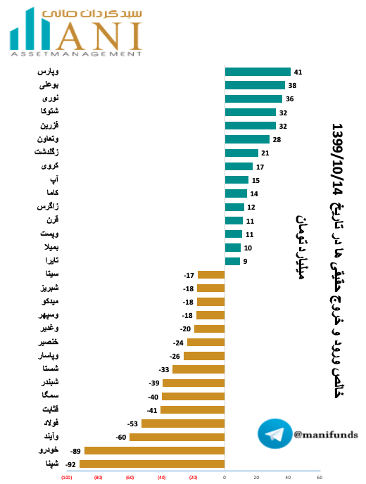 در پایان روز معاملاتی 99/10/14 شرکت های بانک پارسیان و پتروشیمی بوعلی سینا به ترتیب با 41 و 38 میلیارد تومان بیشترین ورود پول توسط حقیقی ها را داشته اند.