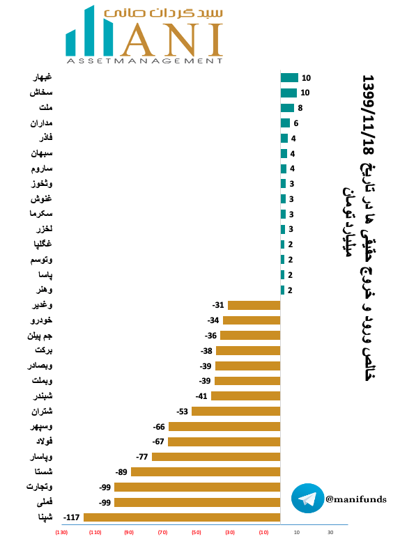 در پایان روز معاملاتی 99/11/18 شرکت های کشت وصنعت بهاران گلبهار خراسان و سیمانخاش به ترتیب با 10 و 10 میلیارد تومان بیشترین ورود پول توسط حقیقی ها را داشته اند.