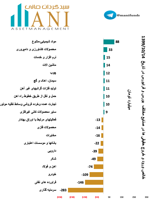 در پایان روز معاملاتی 99/10/14 صنایع مواد شیمیایی-متنوع و محصولات کشاورزی و دامپروری به ترتیب با 88 و 33 میلیارد تومان بیشترین ورود پول توسط حقیقی ها را داشته اند.