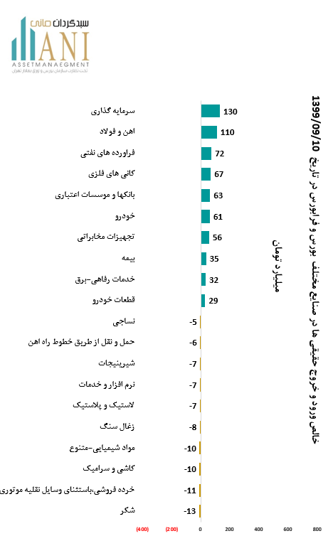 در پایان روز معاملاتی 99/09/10 صنایع سرمایه گذاری و اهن و فولاد به ترتیب با 130 و 110 میلیارد تومان بیشترین ورود پول توسط حقیقی ها را داشته اند.