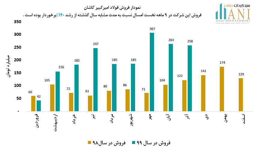 مبلغ فروش فولاد امیر کبیر کاشان طی 9 ماه ابتدایی سال 1399 حدود 1،825 میلیارد تومان بوده که نسبت به دوره مشابه سال گذشته ( 761 میلیارد تومان ) از رشد حدود 140% برخوردار بوده است ،همچنین فروش این شرکت در آذر ماه امسال حدود 258 میلیارد تومان بوده که نسبت به دوره مشابه در سال گذشته (122 میلیارد تومان) از رشد 112% برخوردار بوده است.