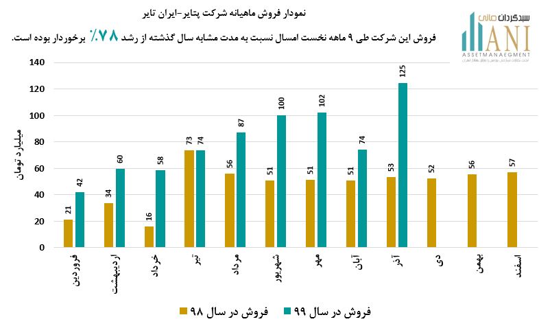 مبلغ فروش شرکت ایران تایر طی 9 ماه ابتدایی سال 1399 حدود 723 میلیارد تومان بوده که نسبت به دوره مشابه سال گذشته ( 406 میلیارد تومان ) از رشد حدود 78% برخوردار بوده است.