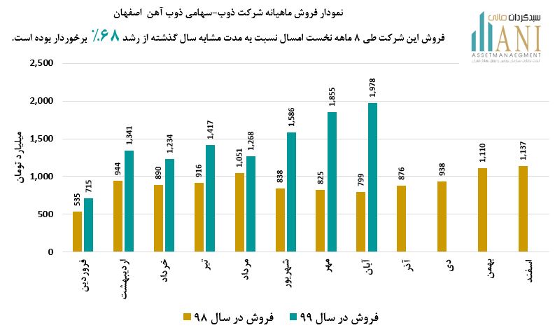 مبلغ فروش شرکت سهامی ذوب آهن اصفهان طی 8 ماه ابتدایی سال 1399 حدود 11،394 میلیارد تومان بوده که نسبت به دوره مشابه سال گذشته ( 6،798 میلیارد تومان ) از رشد حدود 68% برخوردار بوده است.