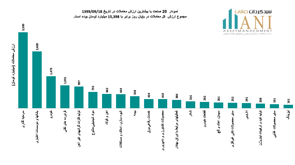 نمودار 20 صنعت با بیشترین ارزش معاملات در تاریخ 1399/09/18، مجموع ارزش کل معاملات در پایان روز برابر با 15,398 میلیارد تومان بوده است. صنایع ،سرمایه گذاری،بانک ها ،خودرو و فراورده های نفتی به ترتیب 23%،17% ،10% و 7% از ارزش کلی معاملات را به خود اختصاص داده اند.
