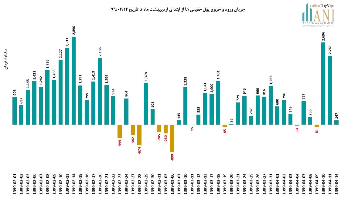 در پایان روز معاملاتی 99/04/14 خالص جریان ورود و خروج پول حقیقی ها حدود مثبت 147 میلیارد تومان می باشد. جریان ورود خروج در خرداد ماه امسال حدود 9,027 میلیارد تومان بوده است.خالص جریان ورود و خرج پول حقیقی ها به بورس در اردیبهشت ماه امسال حدود 25,099 میلیارد تومان بوده است.