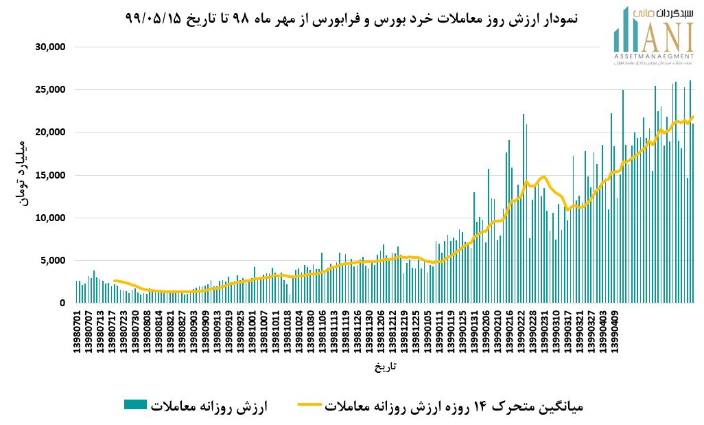 ارزش معاملات خرد سهام در بورس و فرابورس در پایان روز معاملاتی 99/05/15 حدود 21،045 میلیارد تومان و میانگین 14 روزه ارزش معاملات خرد سهام در این تاریخ حدود 21،864 میلیارد تومان بوده است.