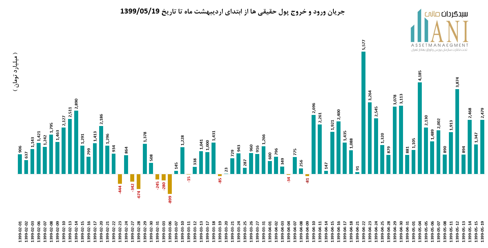 در پایان روز معاملاتی 99/05/19 خالص جریان ورود و خروج پول حقیقی ها حدود مثبت 2,479 میلیارد تومان می باشد. جریان ورود و خروج پول حقیقی ها در سال جاری بدین صورت بوده است: