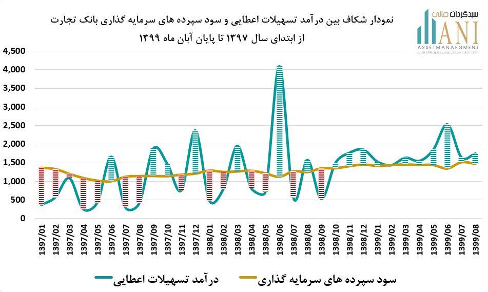 اگر هزینه های سپرده های سرمایه گذاری را از درآمد تسهیلات اعطایی بانک تجارت کم کنیم، شکاف بین درآمد تسهیلات اعطایی و سود سپرده های سرمایه گذاری بدست می آید که افزایش ماهیانه آن باعث بهبود درآمد عملیاتی بانک می گردد.