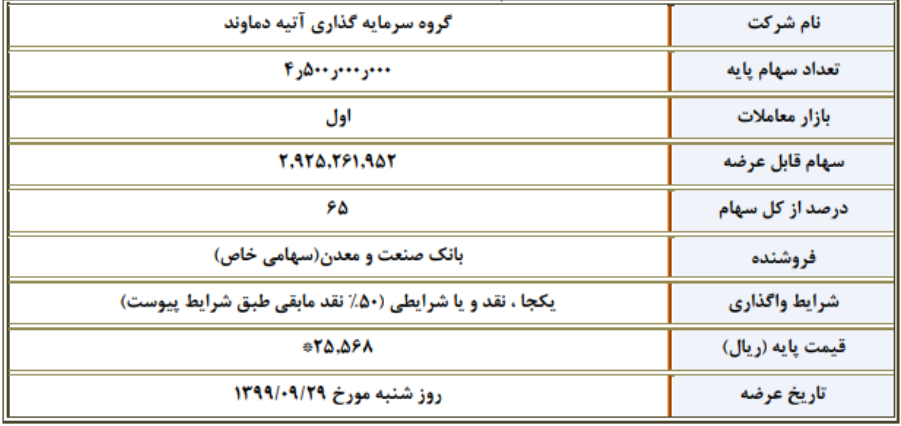 بانک صنعت و معدن در نظر دارد تا تعداد 2،925،261،952 سهم معادل 65 درصد سهام شرکت گروه سرمایه گذاری آتیه دماوند با لحاظ آخرین افزایش سرمایه شرکت و به قیمت پایه 25،568 ریال با نماد بورسی ” وآتی ” را از طریق بورس و اوراق بهادار تهران بطور یکجا و نقد و یا نقد و اقساط و بالاترین قیمت پیشنهادی واگذار نماید .
