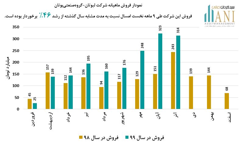 مبلغ فروش شرکت گروه صنعتی بوتان طی 9 ماه ابتدایی سال 1399 حدود 1،725 میلیارد تومان بوده که نسبت به دوره مشابه سال گذشته ( 1،184 میلیارد تومان ) از رشد حدود 46% برخوردار بوده است.