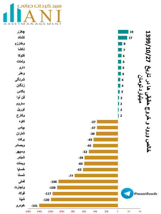در پایان روز معاملاتی 99/10/27 شرکت های صنایع چوب خزر کاسپین و صنایع تولیدی اشتاد ایران به ترتیب با 19 و 17 میلیارد تومان بیشترین ورود پول توسط حقیقی ها را داشته اند.