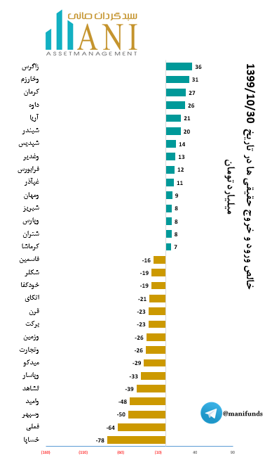 در پایان روز معاملاتی 99/10/30شرکت هایپتروشیمی زاگرس و سرمایه گذاری خوارزمی به ترتیب با 36 و 31 میلیارد تومان بیشترین ورود پول توسط حقیقی ها را داشته اند.
