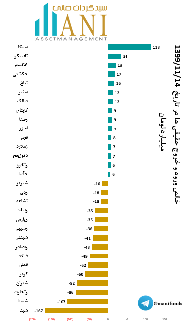در پایان روز معاملاتی 99/11/14 شرکت های گروه سرمایه گذاری میراث فرهنگی و سرمایه گذاری صدرتامین به ترتیب با 113 و 34 میلیارد تومان بیشترین ورود پول توسط حقیقی ها را داشته اند.