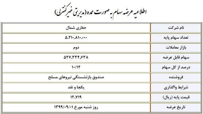 صندوق بازنشستگی نیروهای مسلح روز شنبه مورخ 1399/09/01 ، 10/12% از  سهام شرکت حفاری شمال به تعداد  527،334،638 سهم را به صورت یکجا و نقد با قیمت پایه 12،719 ریال در بازار معاملات دوم عرضه می نماید.
