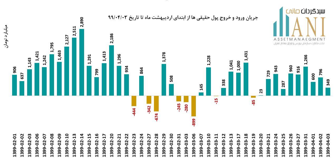 در پایان روز معاملاتی 99/04/03 خالص جریان ورود و خروج پول حقیقی ها حدود مثبت 349 میلیارد تومان می باشد. جریان ورود خروج در خرداد ماه امسال حدود 9,027 میلیارد تومان بوده است.خالص جریان ورود و خرج پول حقیقی ها به بورس در اردیبهشت ماه امسال حدود 25,099 میلیارد تومان بوده است.