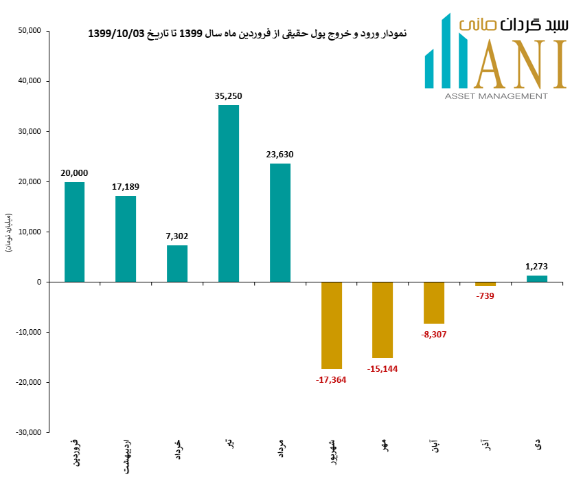 جریان پول حقیقی در ماه های شهریور، مهر و آبان به ترتیب منفی 19 هزار میلیارد تومان، منفی 15 هزار میلیارد تومان و منفی 8 هزار میلیارد تومان بوده، در آذر ماه روند کند شونده خروج پول حقیقی از بازار سهام بورس و فرابورس به 740 میلیارد تومان کاهش یافت و از ابتدای دی ماه تا پایان روز معاملاتی 1399/10/03 شاهد ورود حدودا 1,273 میلیارد تومان پول حقیقی به بازار سهام بورس و فرابورس بوده ایم.