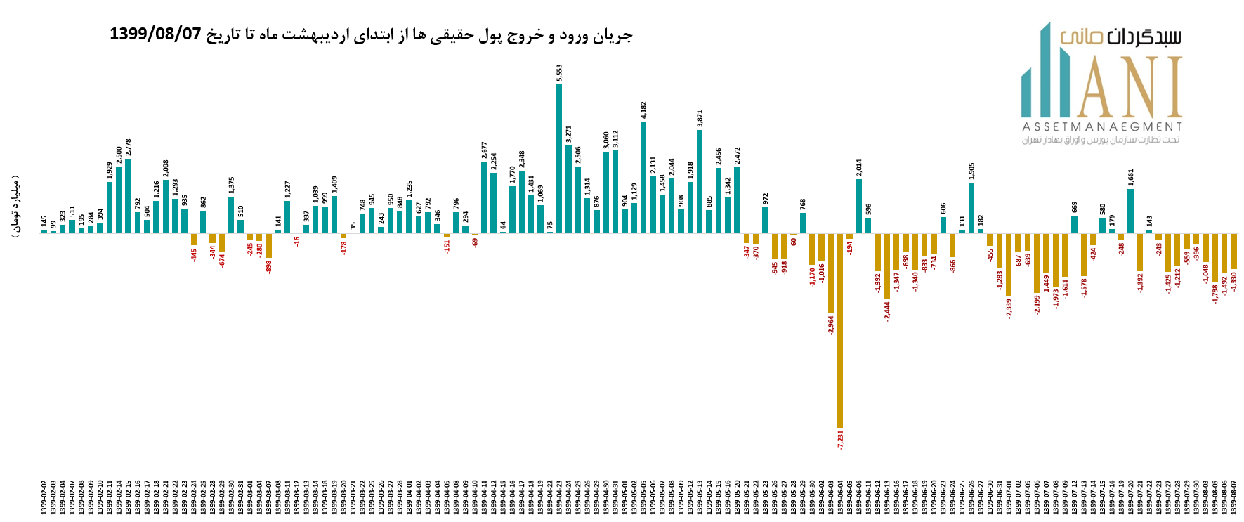 در پایان روز معاملاتی 99/08/07خالص جریان ورود و خروج پول حقیقی ها حدود منفی 1,330 میلیارد تومان می باشد. جریان ورود و خروج پول حقیقی ها در سال جاری بدین صورت بوده است: