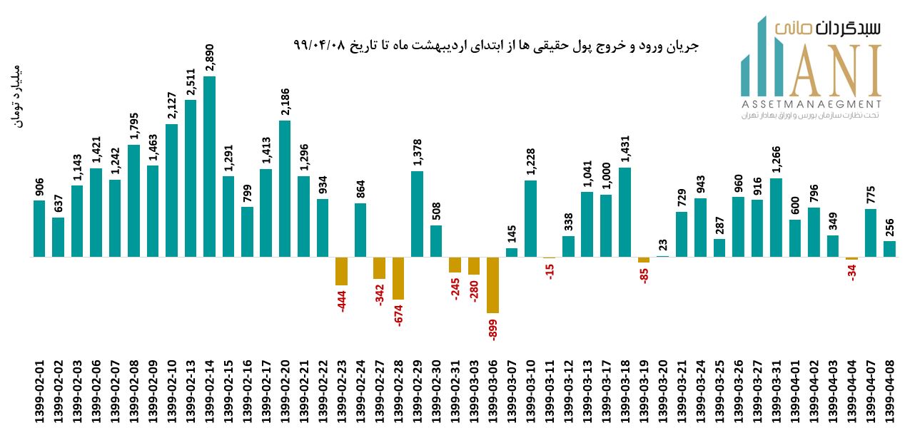 در پایان روز معاملاتی 99/04/08 خالص جریان ورود و خروج پول حقیقی ها حدود مثبت 256 میلیارد تومان می باشد. جریان ورود خروج در خرداد ماه امسال حدود 9,027 میلیارد تومان بوده است.خالص جریان ورود و خرج پول حقیقی ها به بورس در اردیبهشت ماه امسال حدود 25,099 میلیارد تومان بوده است.