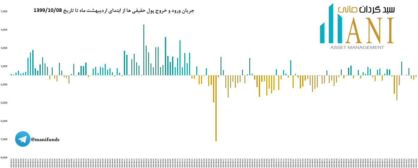در پایان روز معاملاتی 99/10/08خالص جریان ورود و خروج پول حقیقی ها حدود منفی 187 میلیارد تومان می باشد. جریان ورود و خروج پول حقیقی ها در سال جاری بدین صورت بوده است: