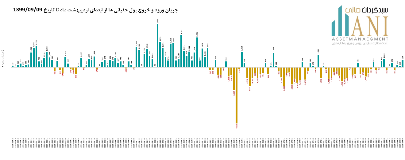 در پایان روز معاملاتی 99/09/09 خالص جریان ورود و خروج پول حقیقی ها حدود مثبت 954 میلیارد تومان می باشد. جریان ورود و خروج پول حقیقی ها در سال جاری بدین صورت بوده است: