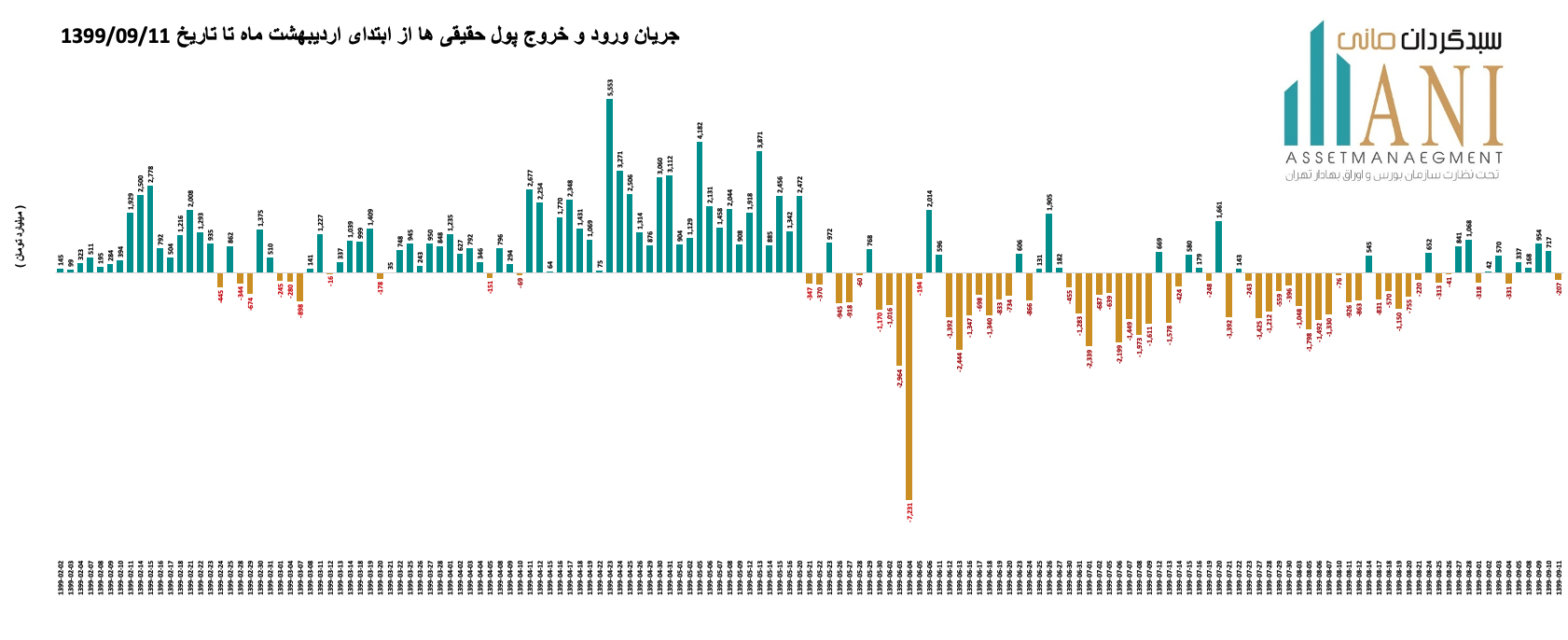 در پایان روز معاملاتی 99/09/10 خالص جریان ورود و خروج پول حقیقی ها حدود منفی 207 میلیارد تومان می باشد. جریان ورود و خروج پول حقیقی ها در سال جاری بدین صورت بوده است: