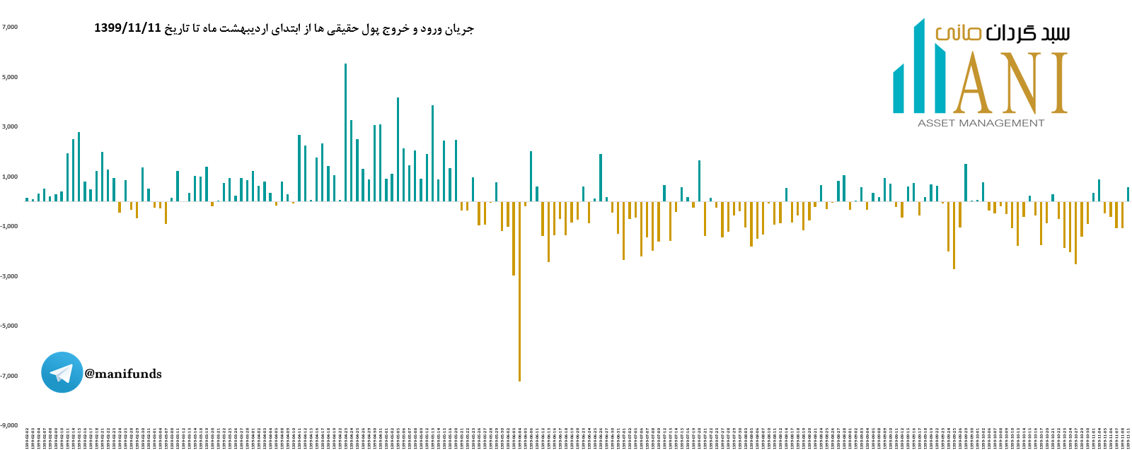 در پایان روز معاملاتی 99/11/11 جریان ورود و خروج پول حقیقی ها حدود مثبت 588 میلیارد تومان می باشد. جریان ورود و خروج پول حقیقی ها در سال جاری بدین صورت بوده است: