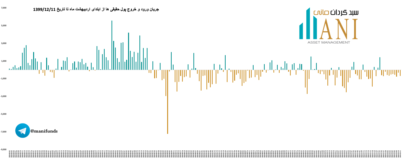 در پایان روز معاملاتی 99/12/11 جریان ورود و خروج پول حقیقی ها حدود منفی 682 میلیارد تومان می باشد. جریان ورود و خروج پول حقیقی ها: