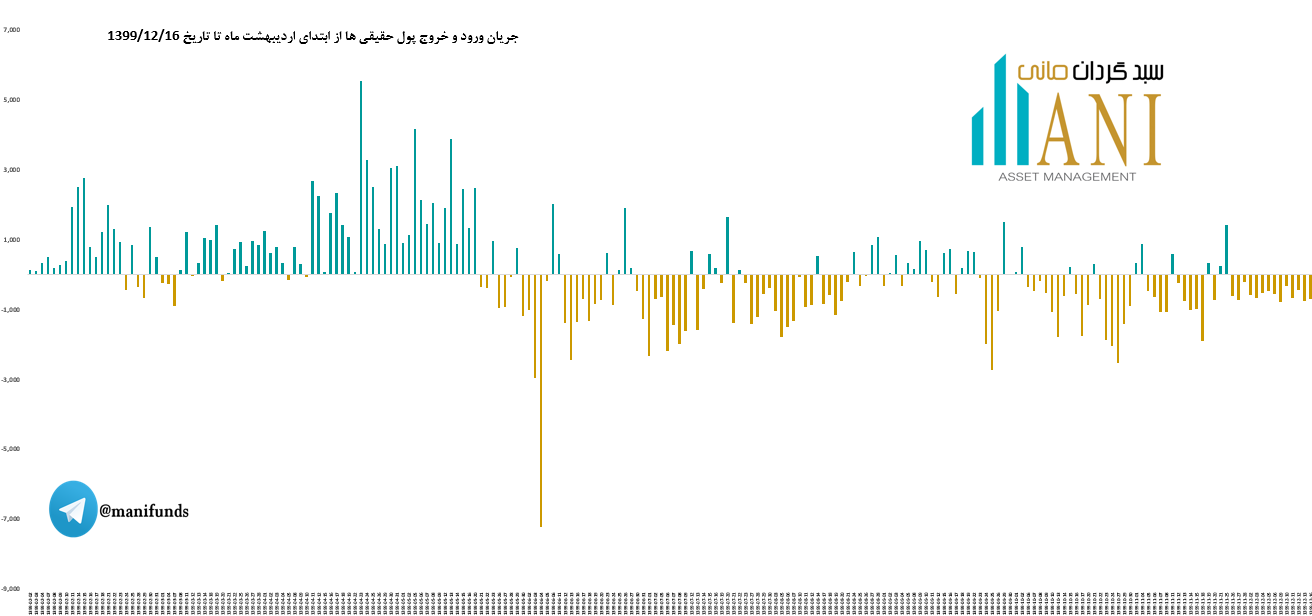 در پایان روز معاملاتی 99/12/16 جریان ورود و خروج پول حقیقی ها حدود منفی 689 میلیارد تومان می باشد. جریان ورود و خروج پول حقیقی ها: