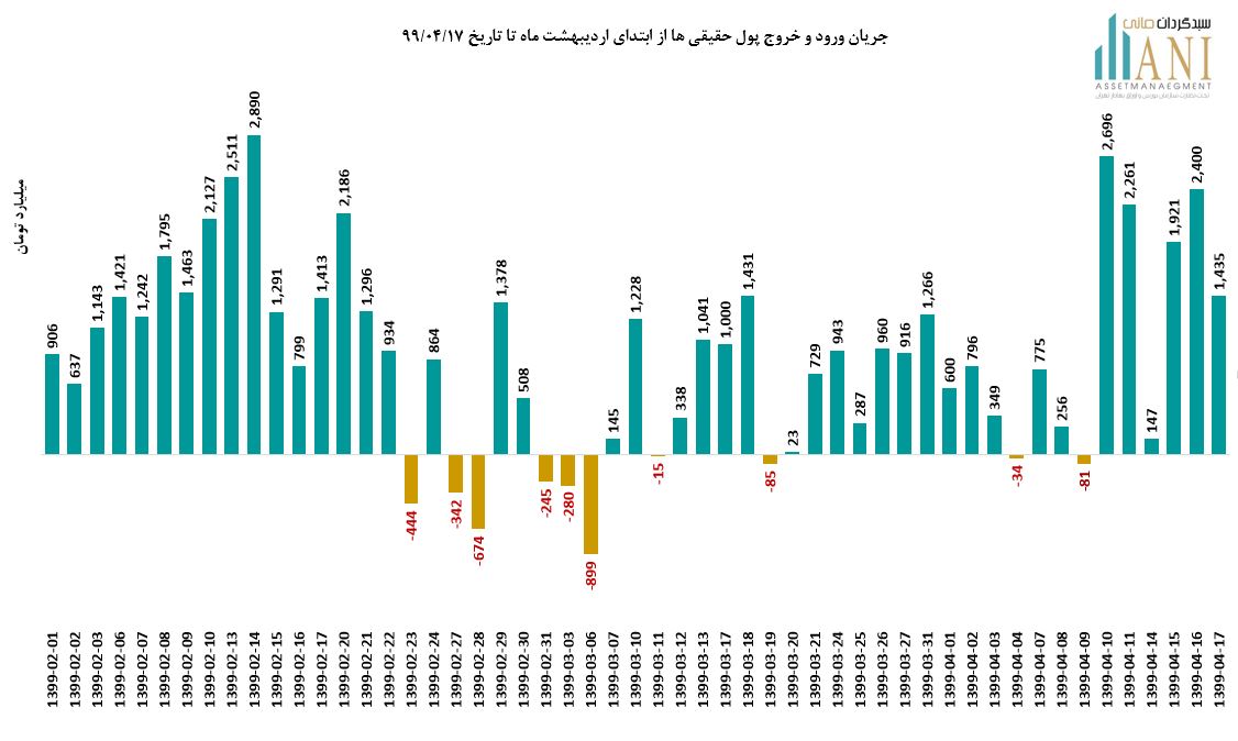 در پایان روز معاملاتی 99/04/17 خالص جریان ورود و خروج پول حقیقی ها حدود مثبت 1,435 میلیارد تومان می باشد.جریان ورود و خروج در تیر ماه امسال حدود 13,522 میلیارد تومان بوده است همچنین جریان ورود و خروج در خرداد ماه امسال حدود 9,027 میلیارد تومان بوده است.خالص جریان ورود و خرج پول حقیقی ها به بورس در اردیبهشت ماه امسال حدود 25,099 میلیارد تومان بوده است.