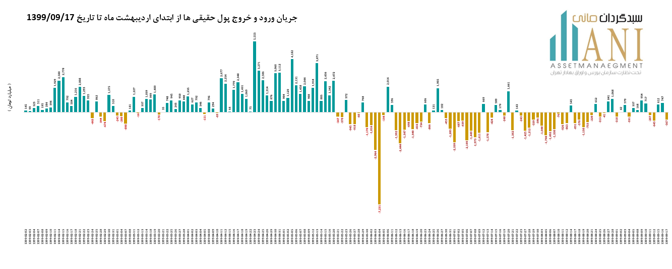 در پایان روز معاملاتی 99/09/17 خالص جریان ورود و خروج پول حقیقی ها حدود منفی 567 میلیارد تومان می باشد. جریان ورود و خروج پول حقیقی ها در سال جاری بدین صورت بوده است:
