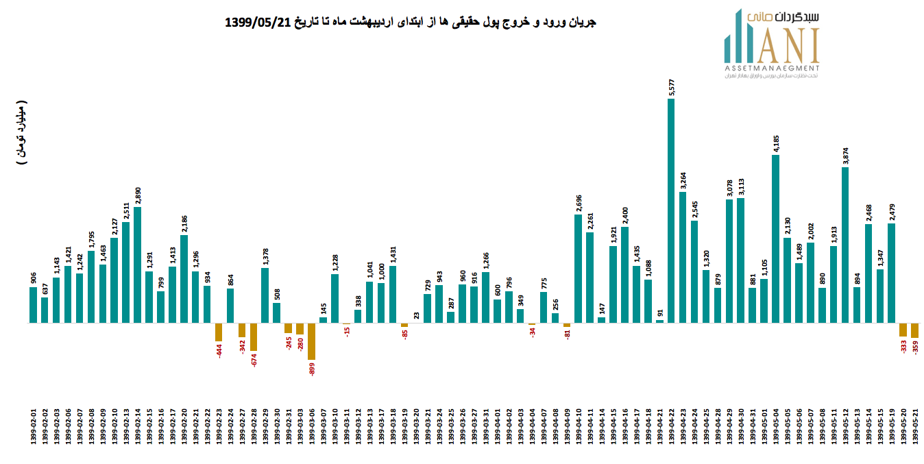 در پایان روز معاملاتی 99/05/21 خالص جریان ورود و خروج پول حقیقی ها حدود منفی 359 میلیارد تومان می باشد. جریان ورود و خروج پول حقیقی ها در سال جاری بدین صورت بوده است:
