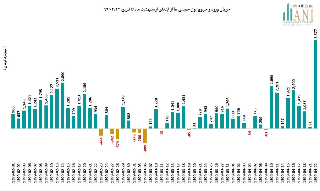 در پایان روز معاملاتی 99/04/22 خالص جریان ورود و خروج پول حقیقی ها حدود مثبت 5,577 میلیارد تومان می باشد.جریان ورود و خروج در تیر ماه امسال حدود 20,272 میلیارد تومان بوده است همچنین جریان ورود و خروج در خرداد ماه امسال حدود 9,027 میلیارد تومان بوده است.خالص جریان ورود و خرج پول حقیقی ها به بورس در اردیبهشت ماه امسال حدود 25,099 میلیارد تومان بوده است.