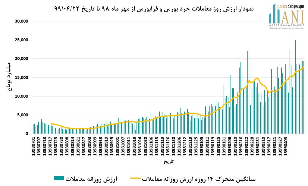 ارزش معاملات خرد سهام در بورس و فرابورس در پایان روز معاملاتی 99/04/22 حدود 19،390 میلیارد تومان و میانگین 14 روزه ارزش معاملات خرد سهام در این تاریخ حدود 17،798 میلیارد تومان بوده است.