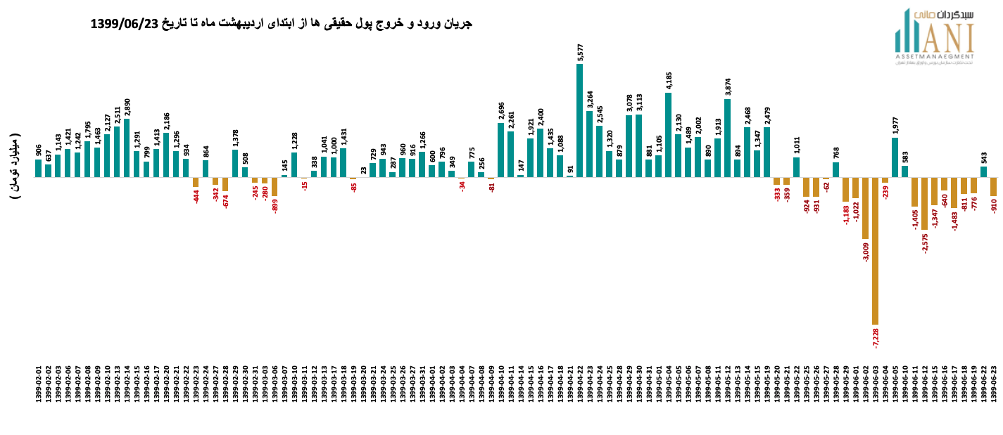 در پایان روز معاملاتی 99/06/23 خالص جریان ورود و خروج پول حقیقی ها حدود  منفی 910 میلیارد تومان می باشد. جریان ورود و خروج پول حقیقی ها در سال جاری بدین صورت بوده است:
