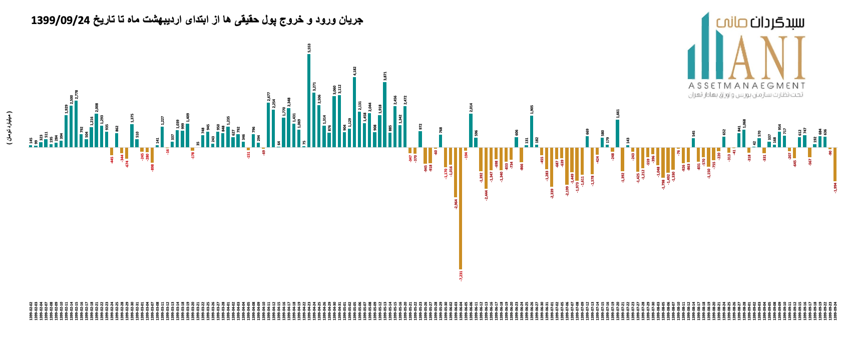 در پایان روز معاملاتی 99/09/24 خالص جریان ورود و خروج پول حقیقی ها حدود منفی 1,994 میلیارد تومان می باشد. جریان ورود و خروج پول حقیقی ها در سال جاری بدین صورت بوده است: