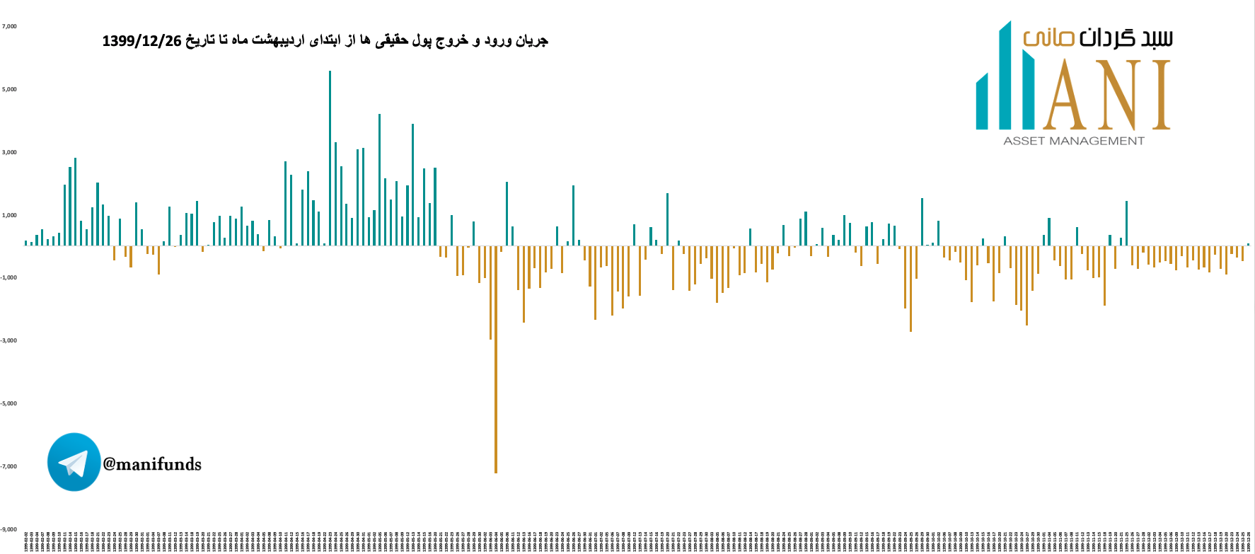خالص جریان ورود و خرج پول حقیقی ها به بورس از 1399/02/01 تا 1399/12/26
