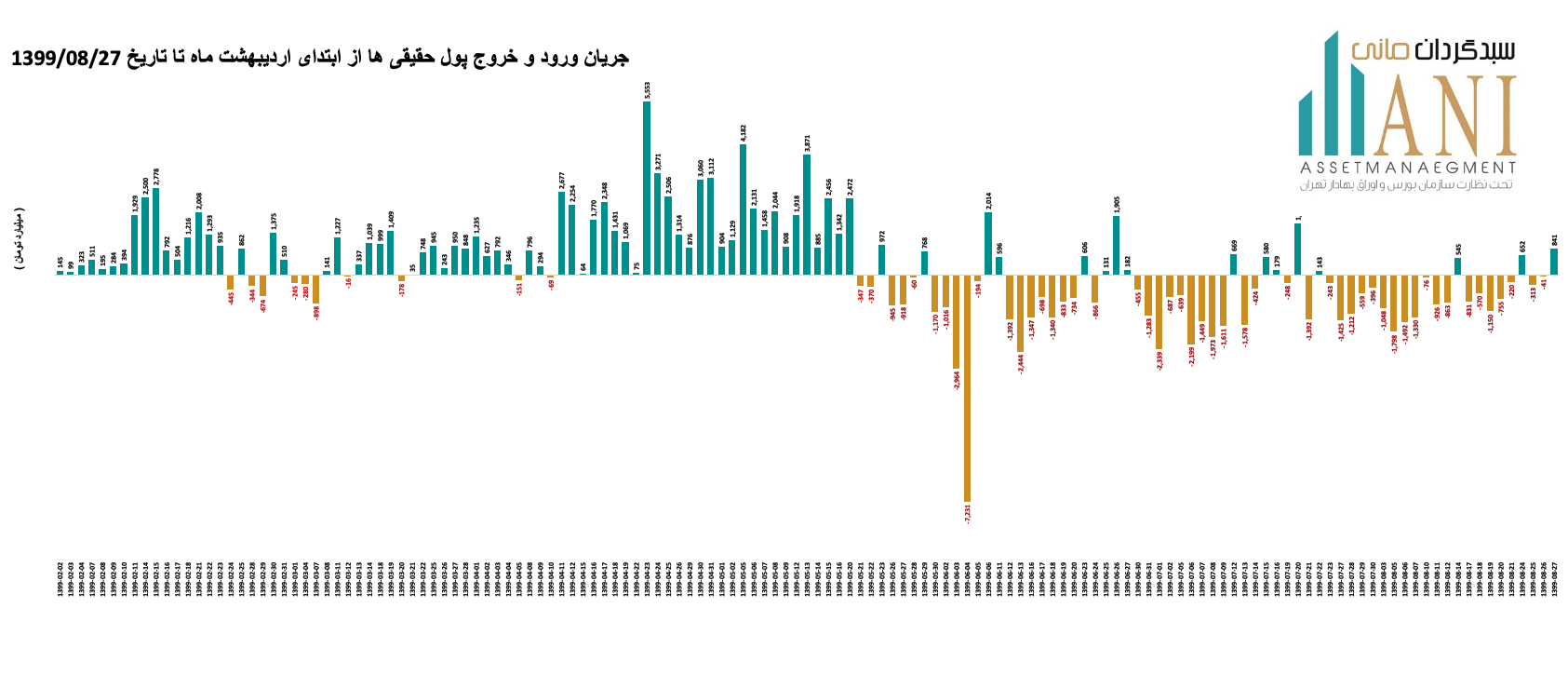در پایان روز معاملاتی 99/08/27 خالص جریان ورود و خروج پول حقیقی ها حدود منفی 841 میلیارد تومان می باشد. جریان ورود و خروج پول حقیقی ها در سال جاری بدین صورت بوده است:
