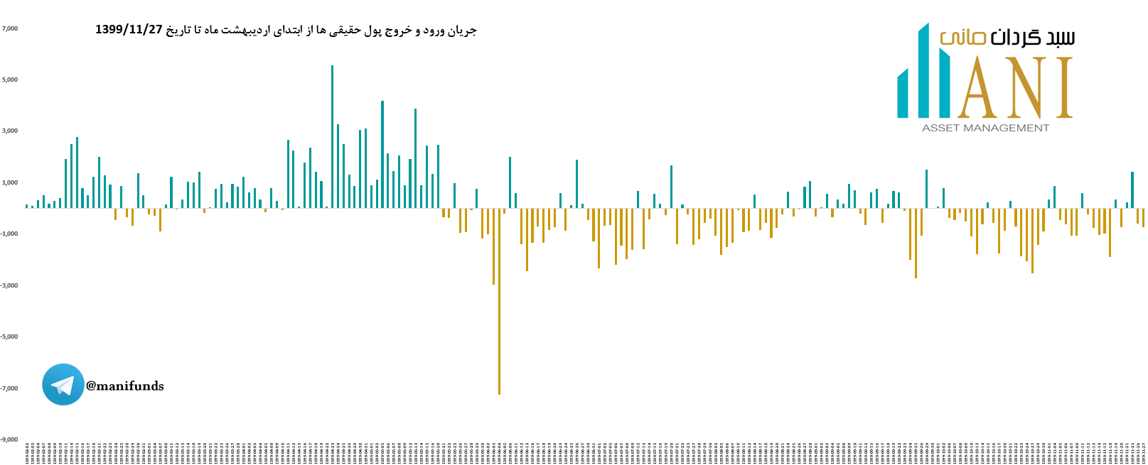 در پایان روز معاملاتی 99/11/27 جریان ورود و خروج پول حقیقی ها حدود منفی 722 میلیارد تومان می باشد. جریان ورود و خروج پول حقیقی ها: