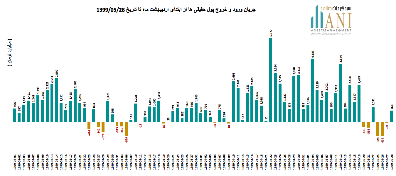 در پایان روز معاملاتی 99/05/28 خالص جریان ورود و خروج پول حقیقی ها حدود مثبت 768 میلیارد تومان می باشد. جریان ورود و خروج پول حقیقی ها در سال جاری بدین صورت بوده است: