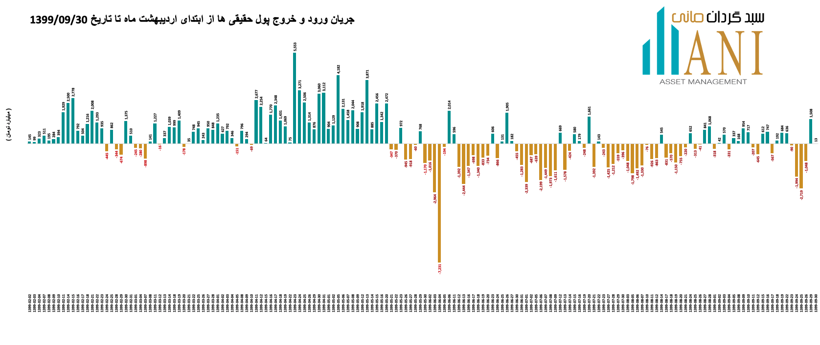 در پایان روز معاملاتی 99/09/30 خالص جریان ورود و خروج پول حقیقی ها حدود مثبت 13 میلیارد تومان می باشد. جریان ورود و خروج پول حقیقی ها در سال جاری بدین صورت بوده است: