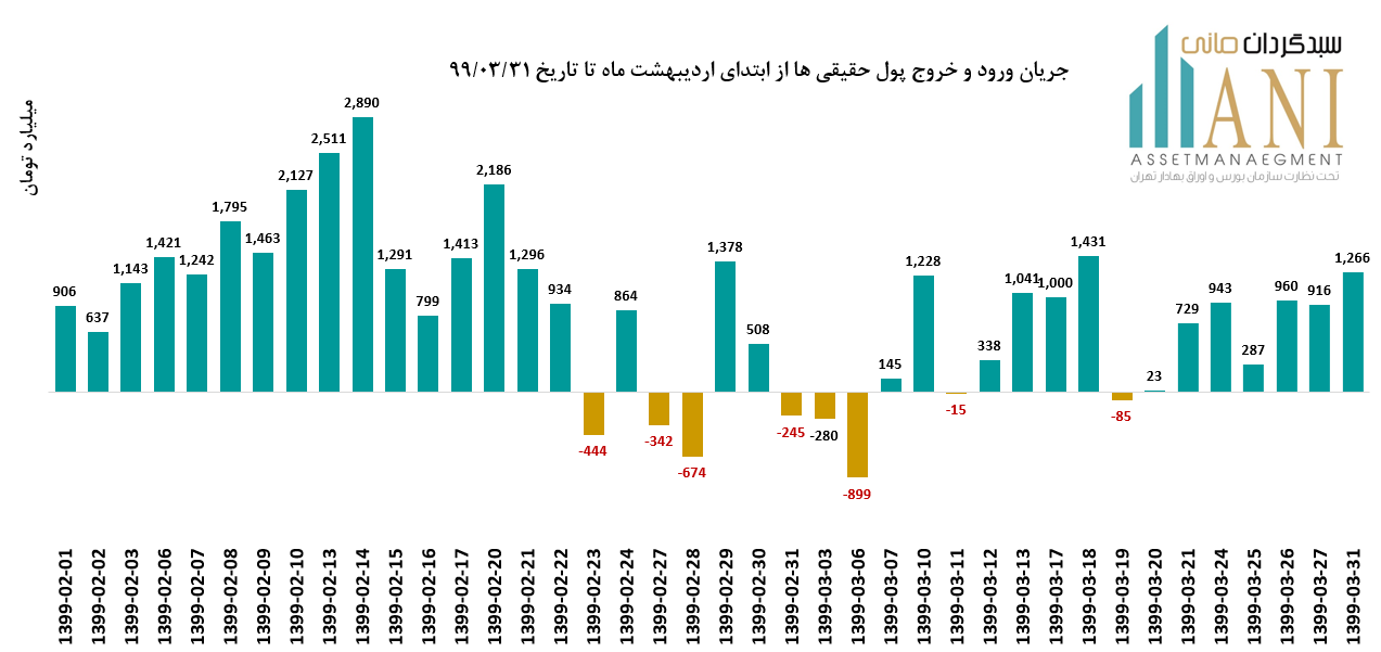 در پایان روز معاملاتی 99/03/31 خالص جریان ورود و خروج پول حقیقی ها حدود مثبت 1,266 میلیارد تومان می باشد. جریان ورود خروج از ابتدای خرداد تا کنون حدود 9,027 میلیارد تومان بوده است.خالص جریان ورود و خرج پول حقیقی ها به بورس در اردیبهشت ماه امسال حدود 25,099 میلیارد تومان بوده است.