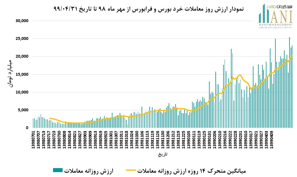 ارزش معاملات خرد سهام در بورس و فرابورس در پایان روز معاملاتی 31/04/99 حدود 23،029 میلیارد تومان و میانگین 14 روزه ارزش معاملات خرد سهام در این تاریخ حدود 20،361 میلیارد تومان بوده است.