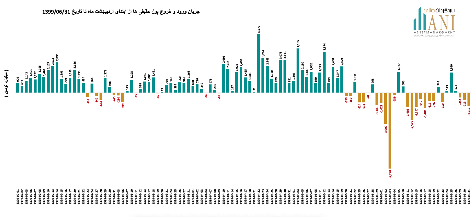 در پایان روز معاملاتی 99/06/31 خالص جریان ورود و خروج پول حقیقی ها حدود منفی 1,262 میلیارد تومان می باشد. جریان ورود و خروج پول حقیقی ها در سال جاری بدین صورت بوده است: