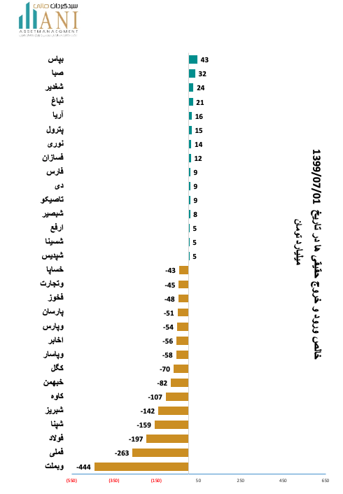 در پایان روز معاملاتی 99/06/31 شرکت های،بيمه پاسارگاد و سرمايه گذاري صبا تامين به ترتیب با 43 و 32 میلیارد تومان بیشترین ورود پول توسط حقیقی ها را داشته اند.