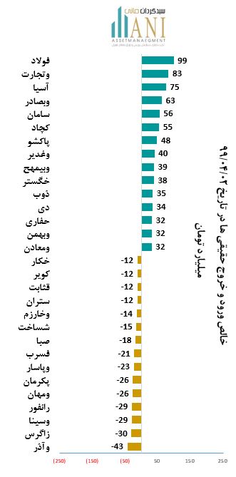 در پایان روز معاملاتی 99/04/02 شرکت های، فولاد مباركه اصفهان و بانك تجارت به ترتیب با 99 و 83 میلیارد تومان بیشترین ورود پول توسط حقیقی ها را داشته اند.