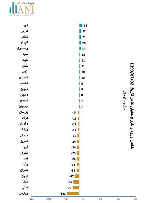 در پایان روز معاملاتی 99/07/02 شرکت های بانك دي و صنايع پتروشيمي خليج فارس‌‌ به ترتیب با 38 و 22 میلیارد تومان بیشترین ورود پول توسط حقیقی ها را داشته اند.